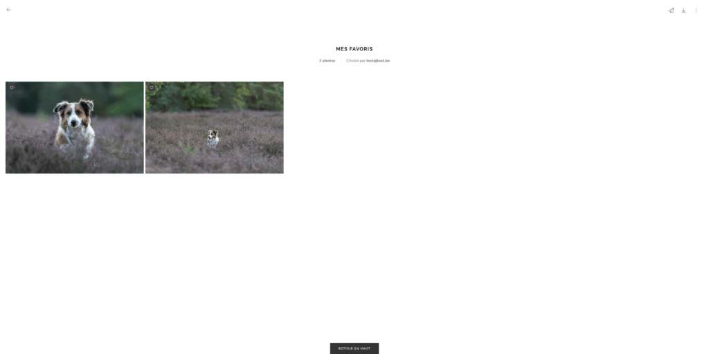 Enfin, une fois votre choix définitif, il faut m’envoyer le dossier en revenant dans le dossier des favoris et en cliquant sur la flèche (en haut à droite), puis sur « envoyer au photographe ».