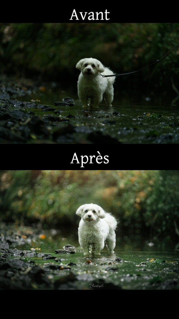 Certaines choses sont effacĂ©es pour une meilleure lecture de l’image, et pour la beautĂ© du sujet (par exemple la laisse, le harnais, le bras de la personne qui tient le chien, les branches qui gĂȘnent, …).