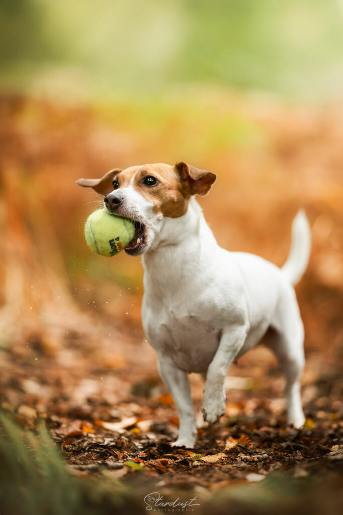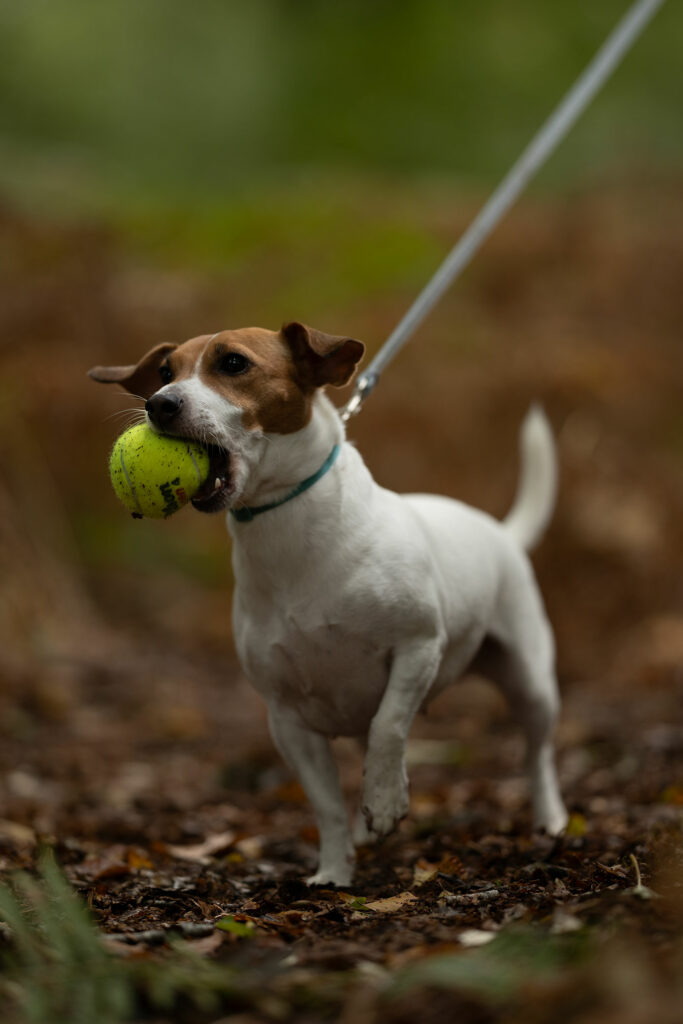 → La plupart des photos sont prises avec le chien en laisse, ça permet de le positionner idéalement sans lui demander de rester en place de lui-même. A la retouche de la photo, j’efface facilement la laisse, le collier, et même le bout de bras qui dépasse dans le cadre.